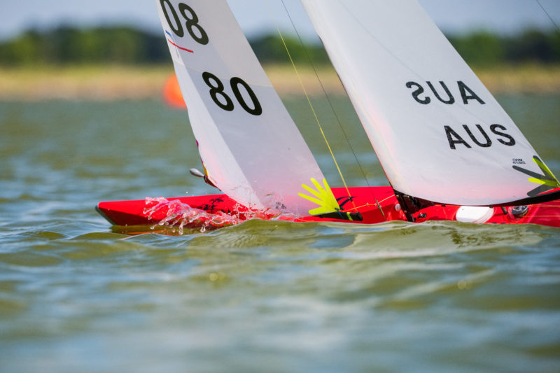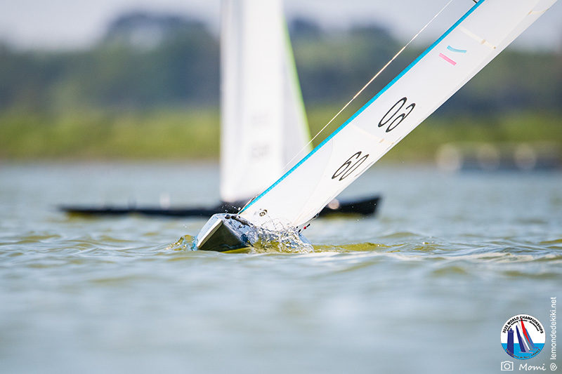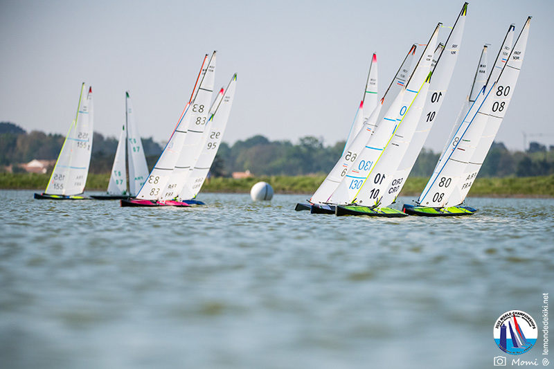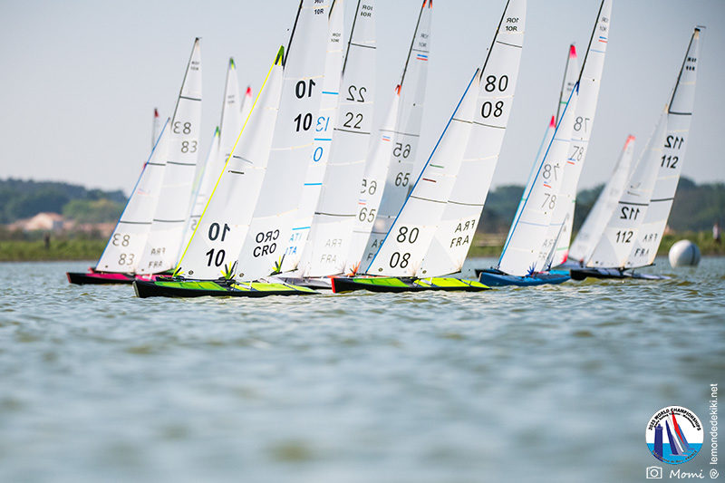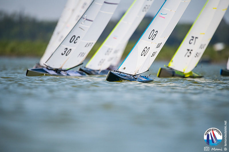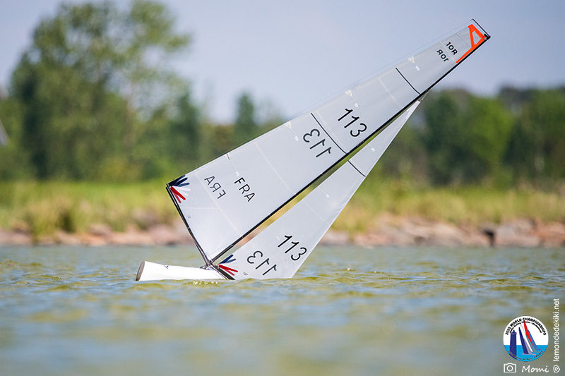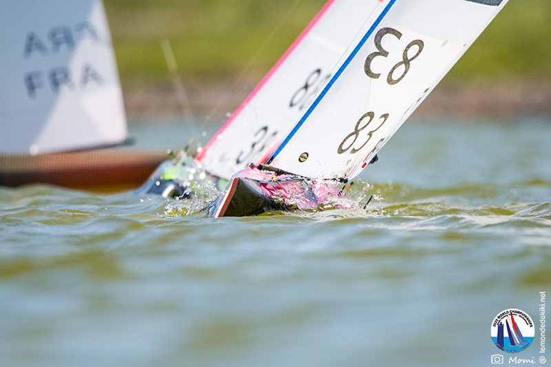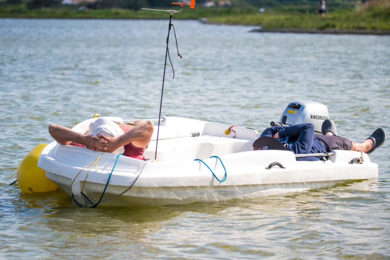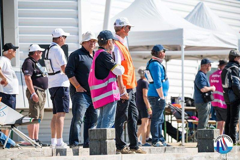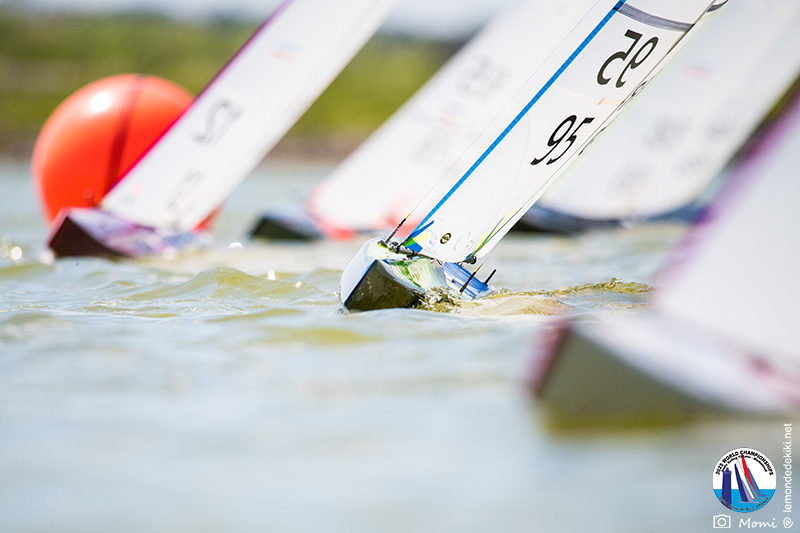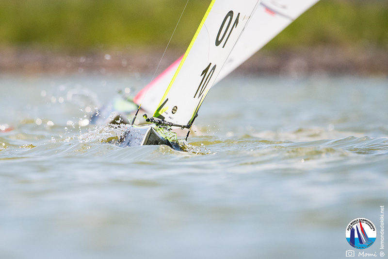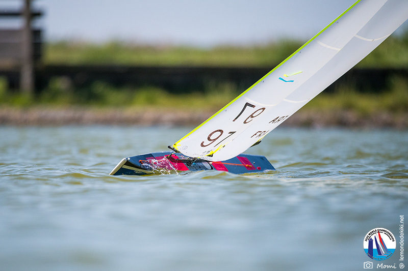 [Today, the wind has changed. So the course is set out in front of the building. It must be said that this is not to displease Momi, who, like a true lazy princess, envisages this day as more relaxing and refreshing. The day obviously begins with a briefing, warning about the « shallows ». And off we go for race 4C. Momi wastes no time getting into the water to take advantage of this perfect situation: wind, sun, and the possibility of getting down to the water’s surface. Okay, for the refreshing side, I’ll tick it, but for the relaxing side, how can I say… nothing actually! 😀 In the morning, 2 races of the 3 fleets are given, before rushing off to eat. If a few wanted to try game B, it is games A, and A heavy that have had the best part. The course was just reworked once in the afternoon. But thanks to the stability of the wind, and the motivation of the competitors, and the volunteers who revisited « cruising is fun », the day was concluded with the 9C race.]