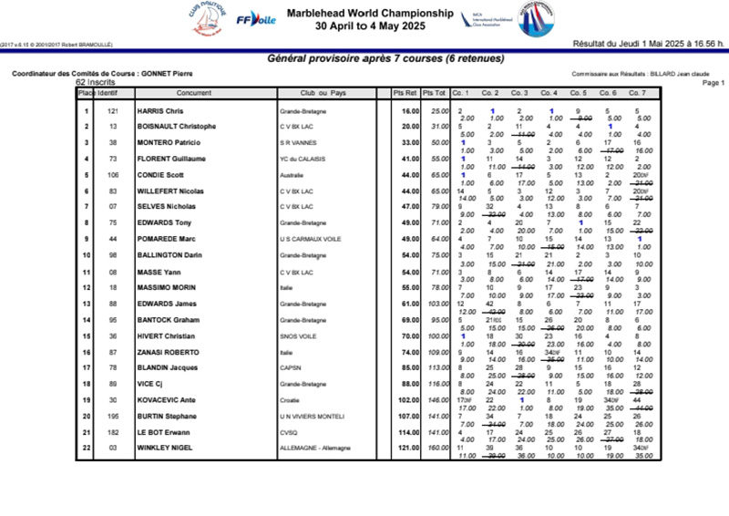 Le général provisoire de ce jeudi soir après 7 courses, confirme Chris Harris GBR121 (16pts), devant Christophe Boisnault FRA13 (20pts) et Patrice Montero FRA38 (33pts). [As for the weather, this time the wind is from the south and turns to the southwest towards the end of the day, favoring the A and B rigs all day, then the A rig at the end of the day under scattered rain. The provisional overall standings for this Thursday evening after seven races are confirmed by Chris Harris GBR121 (16 points), ahead of Christophe Boisnault FRA13 (20 points) and Patrice Montero FRA38 (33 points).]