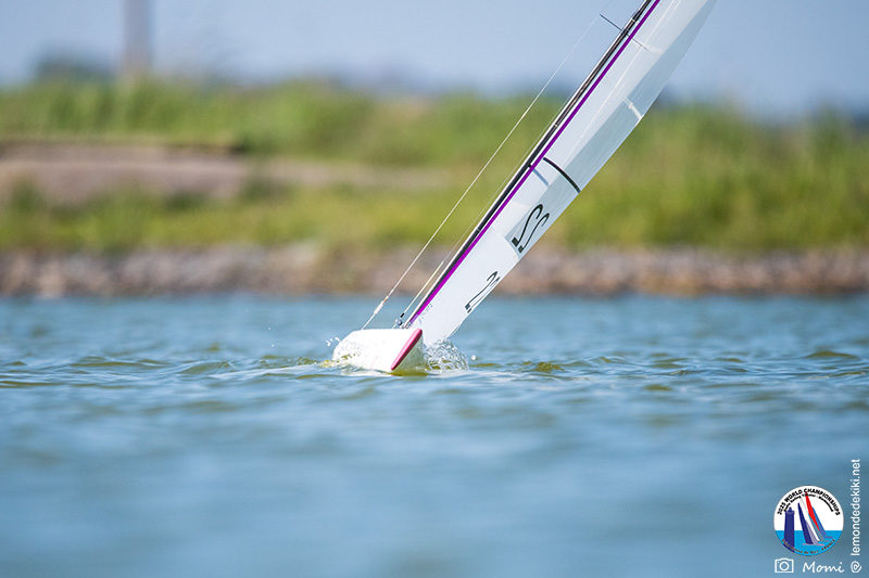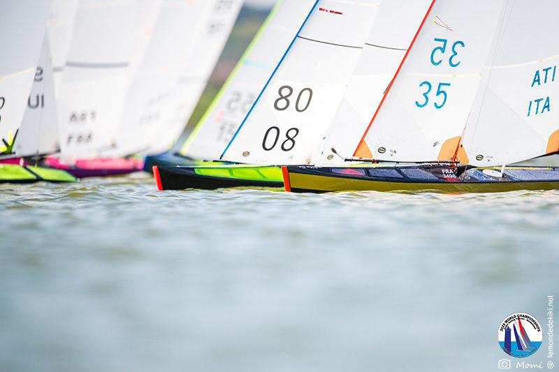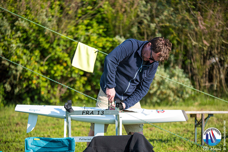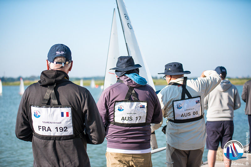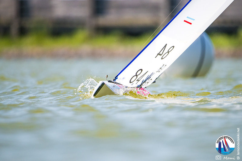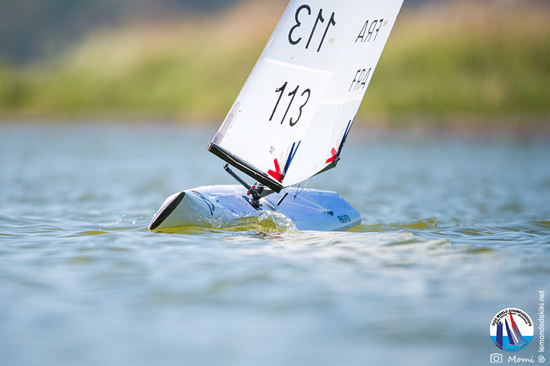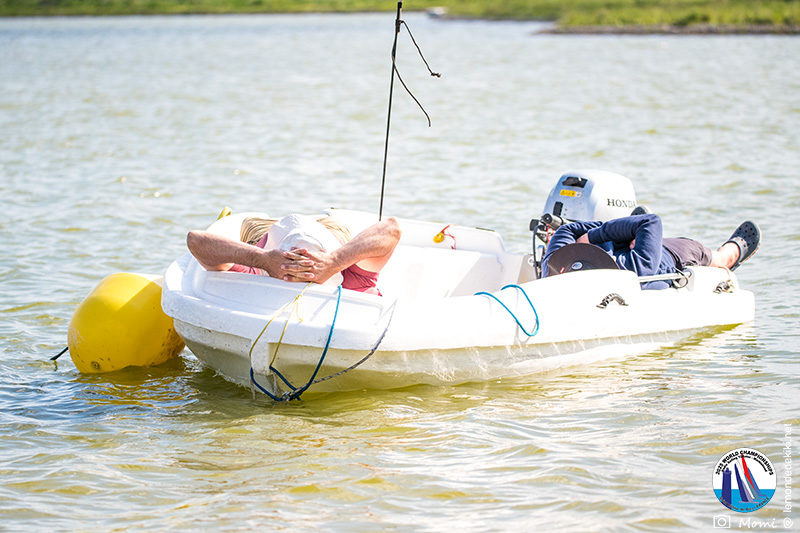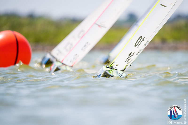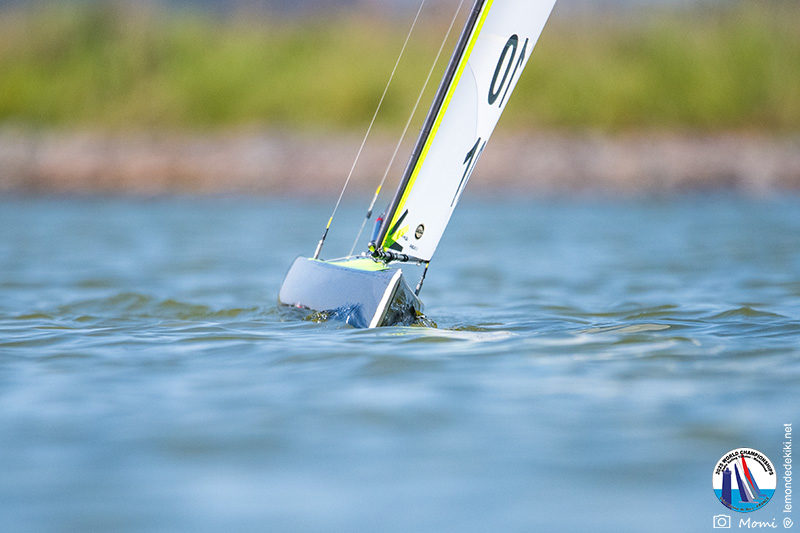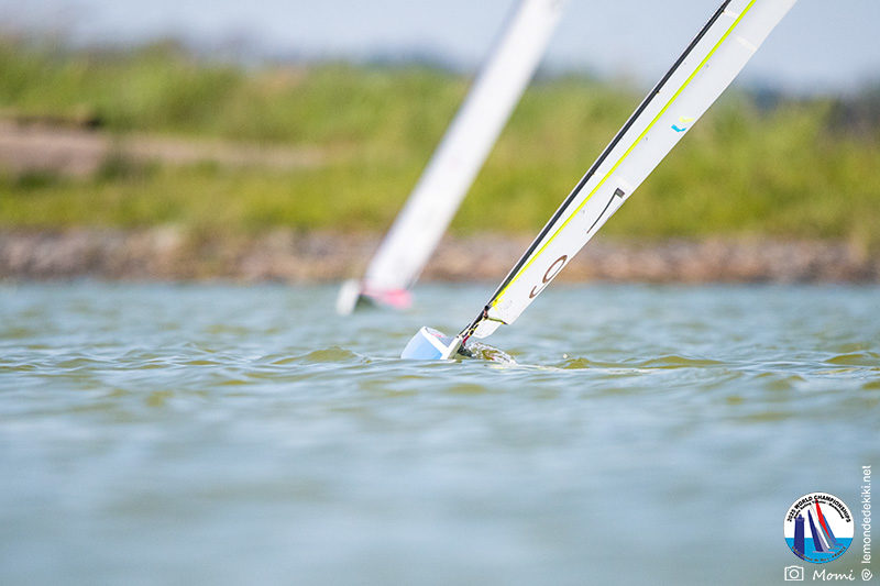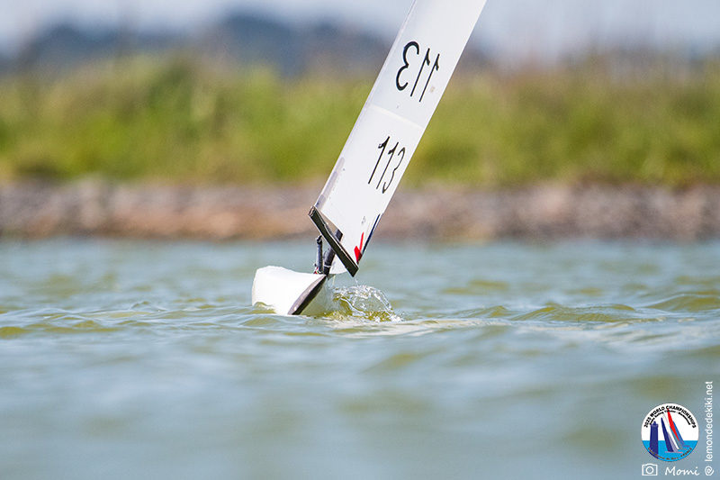 La journée se termine donc avec Graham Bantock GBR95 (26pts) qui se hisse sur la première marche temporaire devant Ante Kovacevic CRO10 (29pts) à seulement 3 pts, alors qu’il pointait hier soir à la 11ième place à 21pts du premier, suivi de Florent Guillaume FRA73 (31pts) qui a eu une fin de journée compliquée (13 sur la course 8 et 19 sur la course 9). [Already 6 races validated, the 6A is over. It’s time to go eat… with a big smile for this last photo. Not that I’m making fun of a tack that steals the show from the splashes, but I’m delighted once again to have the photo of Rémi FRA142’s boat racing with a midge, which is becoming customary, even a challenge for Momi. Mustache, midge, the step is not that of a large giraffe, it would be more like the wingbeat of a small insect! The day ended like this, under the sun, to be exact! Christophe Boisnault retired following two incidents with his new canting mast, not having access to the tackle sheet within the allotted time, which had snapped. However, he is pleased with the effectiveness of this innovation, and does not intend to stop there; it’s a case to follow closely. In the meantime, the « cruise has fun » has well deserved a little rest! 😀 The day thus ended with Graham Bantock GBR95 (26 points) moving up to the temporary top spot ahead of Ante Kovacevic CRO10 (29 points), just 3 points behind. Last night, he was in 11th place, 21 points behind the leader, followed by Florent Guillaume FRA73 (31 points), who had a difficult end to the day (13 points in race 8 and 19 points in race 9).]