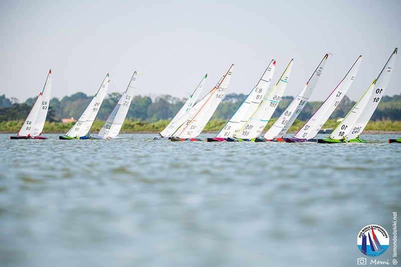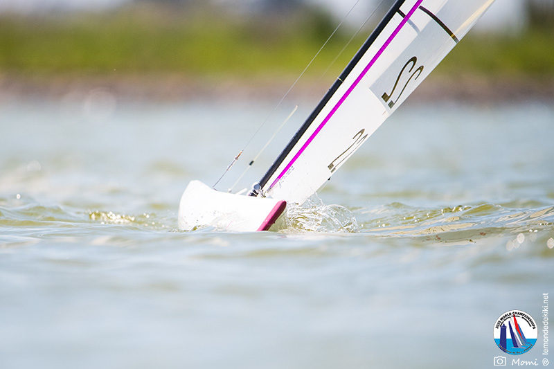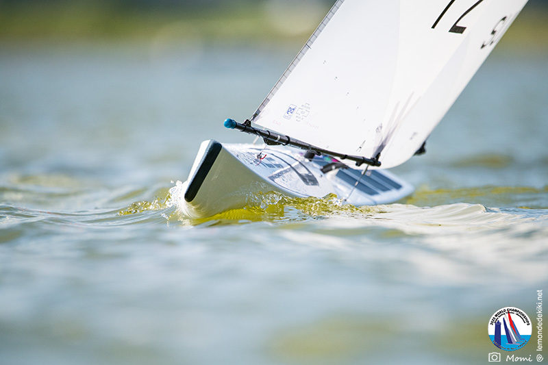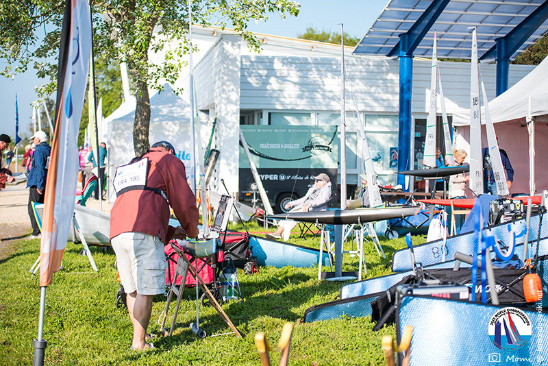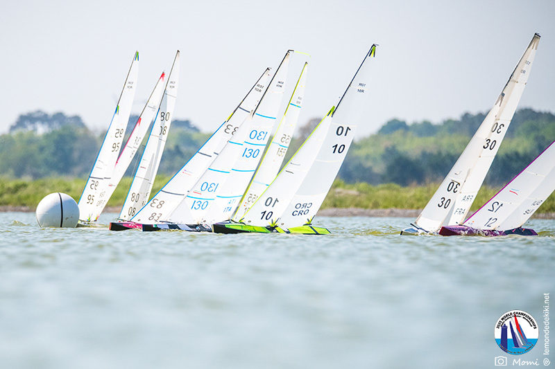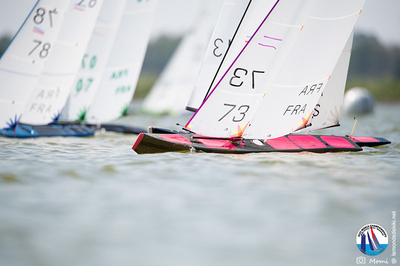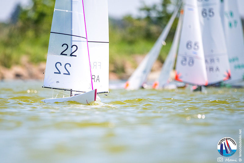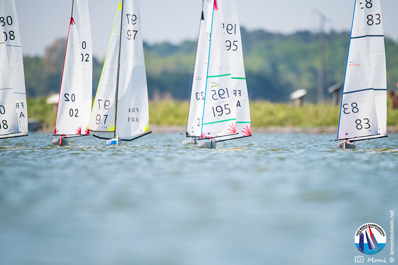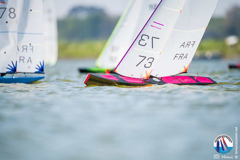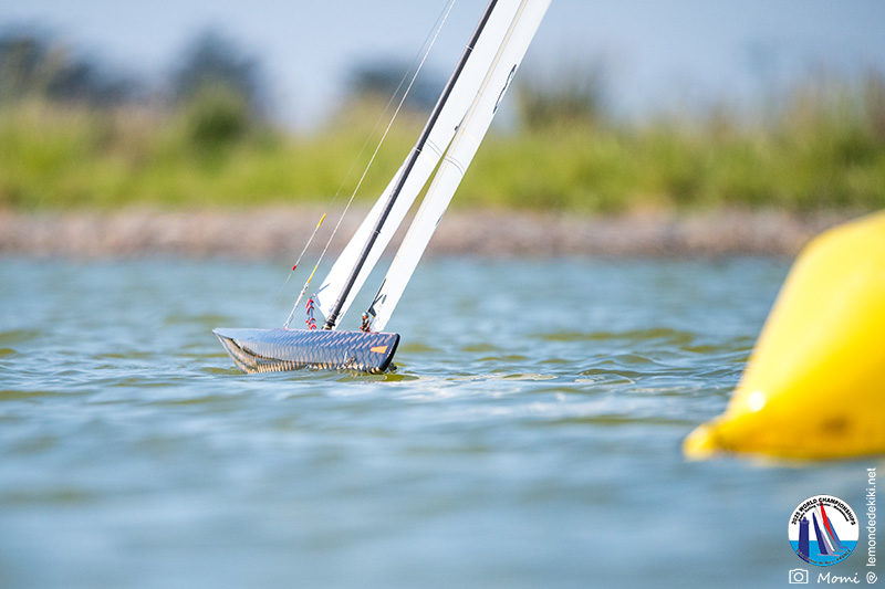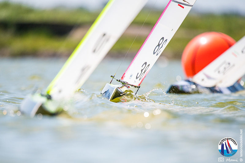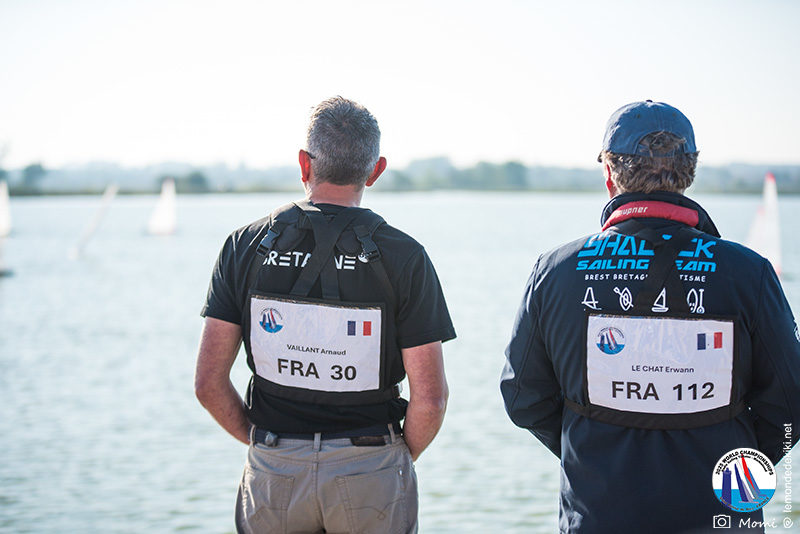 La journée se termine donc avec Graham Bantock GBR95 (26pts) qui se hisse sur la première marche temporaire devant Ante Kovacevic CRO10 (29pts) à seulement 3 pts, alors qu’il pointait hier soir à la 11ième place à 21pts du premier, suivi de Florent Guillaume FRA73 (31pts) qui a eu une fin de journée compliquée (13 sur la course 8 et 19 sur la course 9). [Already 6 races validated, the 6A is over. It’s time to go eat… with a big smile for this last photo. Not that I’m making fun of a tack that steals the show from the splashes, but I’m delighted once again to have the photo of Rémi FRA142’s boat racing with a midge, which is becoming customary, even a challenge for Momi. Mustache, midge, the step is not that of a large giraffe, it would be more like the wingbeat of a small insect! The day ended like this, under the sun, to be exact! Christophe Boisnault retired following two incidents with his new canting mast, not having access to the tackle sheet within the allotted time, which had snapped. However, he is pleased with the effectiveness of this innovation, and does not intend to stop there; it’s a case to follow closely. In the meantime, the « cruise has fun » has well deserved a little rest! 😀 The day thus ended with Graham Bantock GBR95 (26 points) moving up to the temporary top spot ahead of Ante Kovacevic CRO10 (29 points), just 3 points behind. Last night, he was in 11th place, 21 points behind the leader, followed by Florent Guillaume FRA73 (31 points), who had a difficult end to the day (13 points in race 8 and 19 points in race 9).]