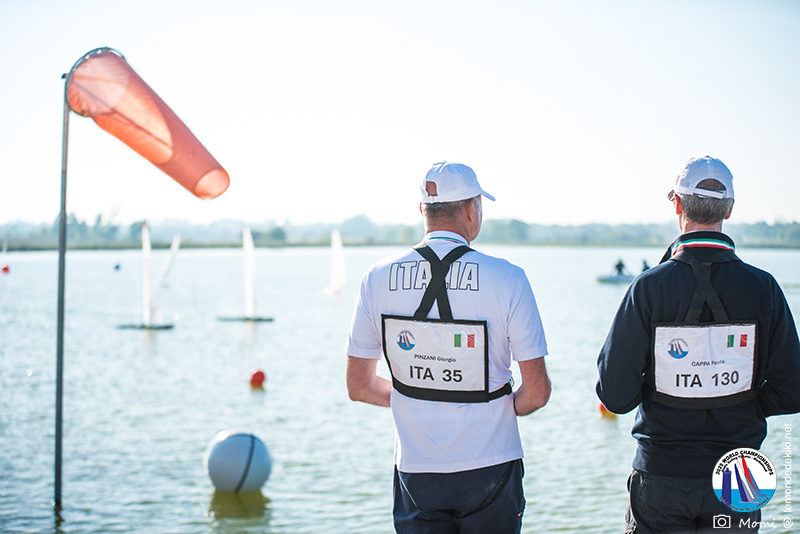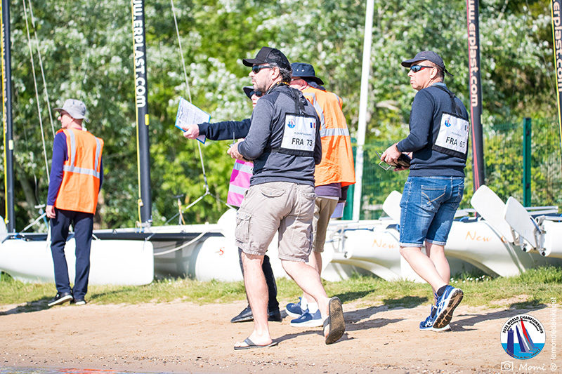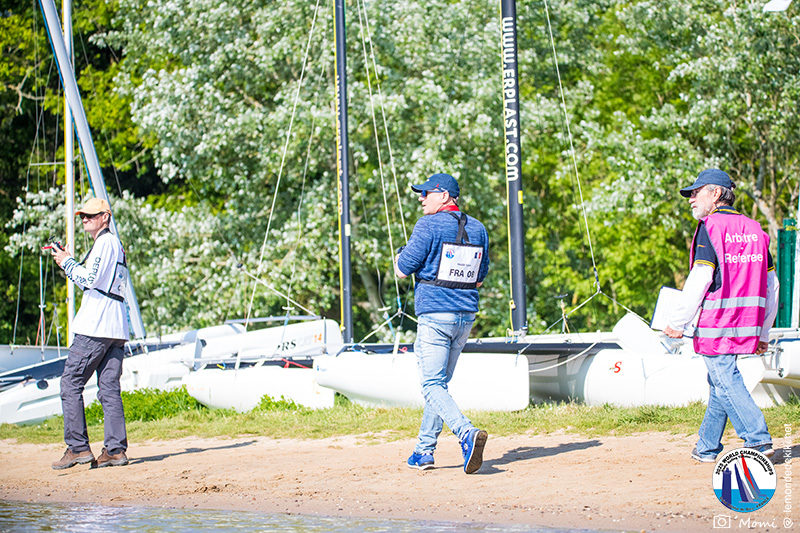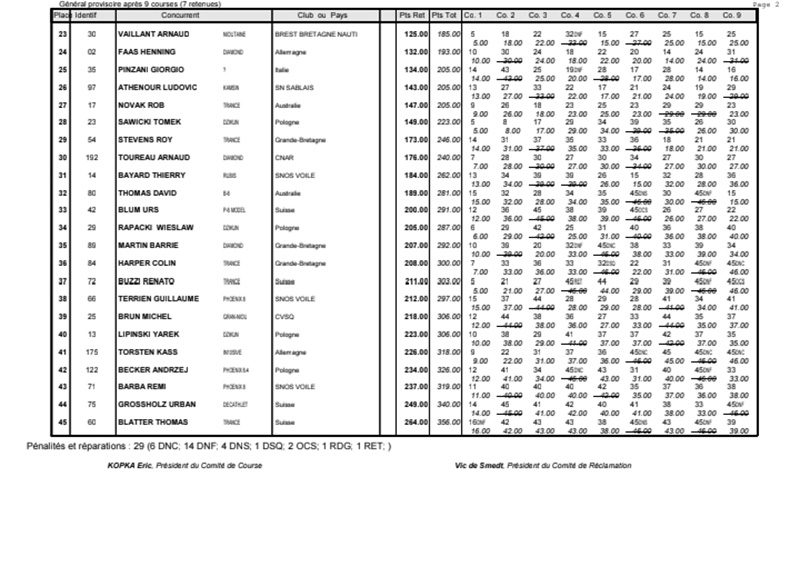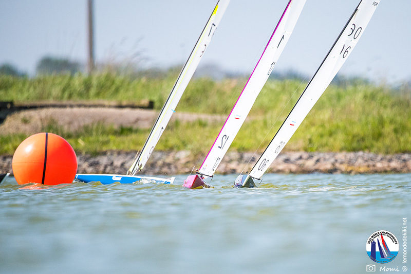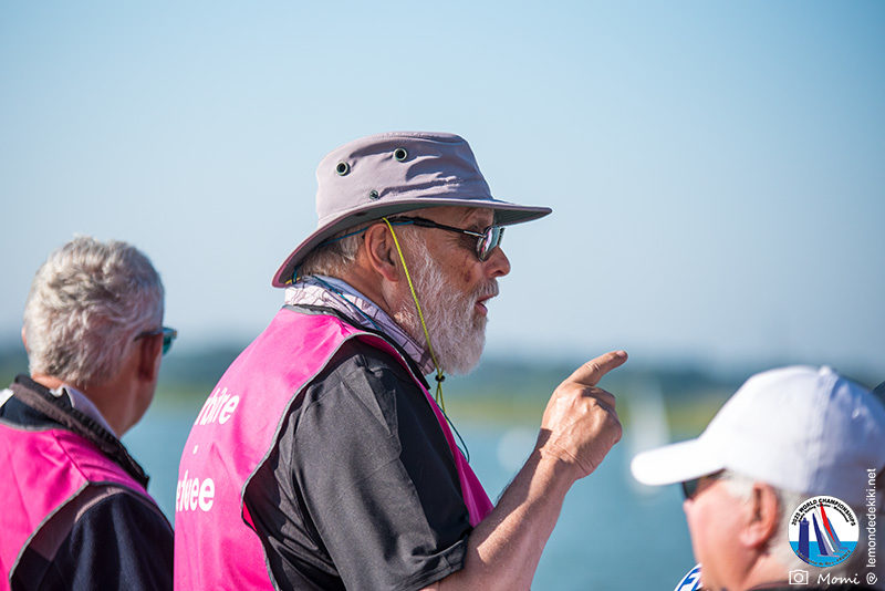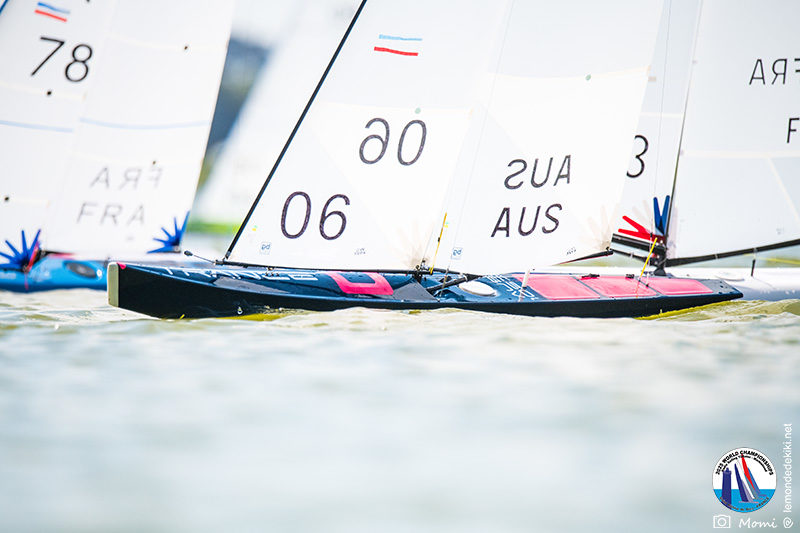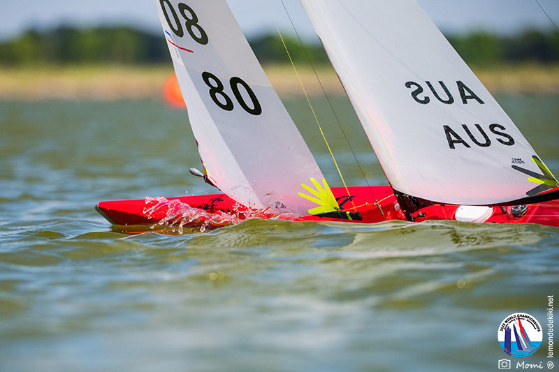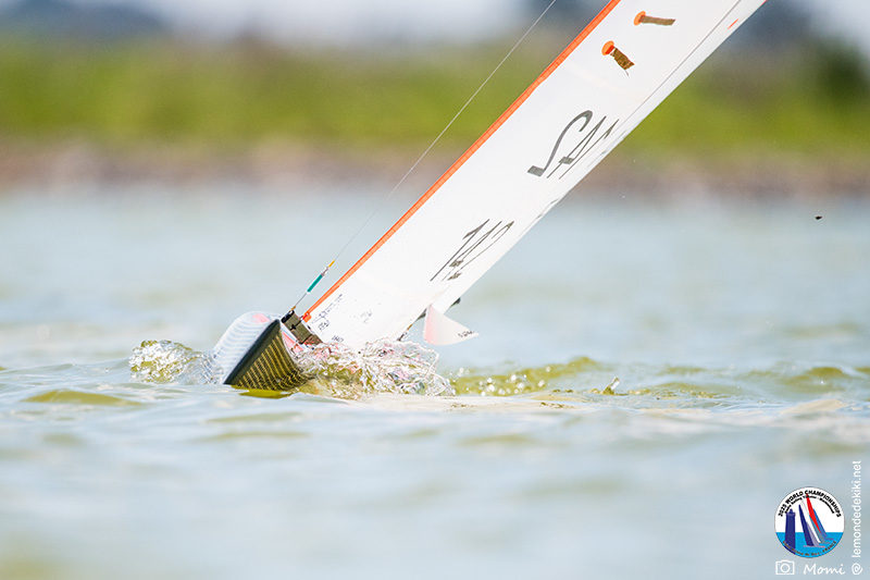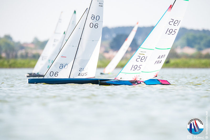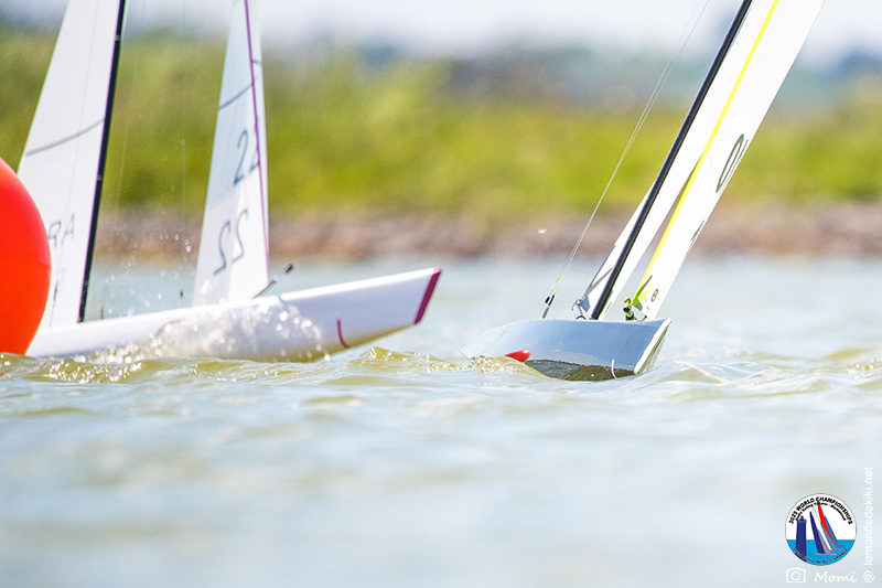 La journée se termine donc avec Graham Bantock GBR95 (26pts) qui se hisse sur la première marche temporaire devant Ante Kovacevic CRO10 (29pts) à seulement 3 pts, alors qu’il pointait hier soir à la 11ième place à 21pts du premier, suivi de Florent Guillaume FRA73 (31pts) qui a eu une fin de journée compliquée (13 sur la course 8 et 19 sur la course 9). [Already 6 races validated, the 6A is over. It’s time to go eat… with a big smile for this last photo. Not that I’m making fun of a tack that steals the show from the splashes, but I’m delighted once again to have the photo of Rémi FRA142’s boat racing with a midge, which is becoming customary, even a challenge for Momi. Mustache, midge, the step is not that of a large giraffe, it would be more like the wingbeat of a small insect! The day ended like this, under the sun, to be exact! Christophe Boisnault retired following two incidents with his new canting mast, not having access to the tackle sheet within the allotted time, which had snapped. However, he is pleased with the effectiveness of this innovation, and does not intend to stop there; it’s a case to follow closely. In the meantime, the « cruise has fun » has well deserved a little rest! 😀 The day thus ended with Graham Bantock GBR95 (26 points) moving up to the temporary top spot ahead of Ante Kovacevic CRO10 (29 points), just 3 points behind. Last night, he was in 11th place, 21 points behind the leader, followed by Florent Guillaume FRA73 (31 points), who had a difficult end to the day (13 points in race 8 and 19 points in race 9).]