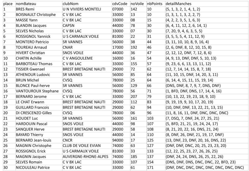 Bravo, et merci à tous pour ces moments partagés, sérieux ou moins sérieux, mais toujours humains. Je te laisse quelques frimousses en souvenirs, et le résultat de ces deux jours de grade 4 regroupant 30 skippers, sur 8 courses en deux flottes.
